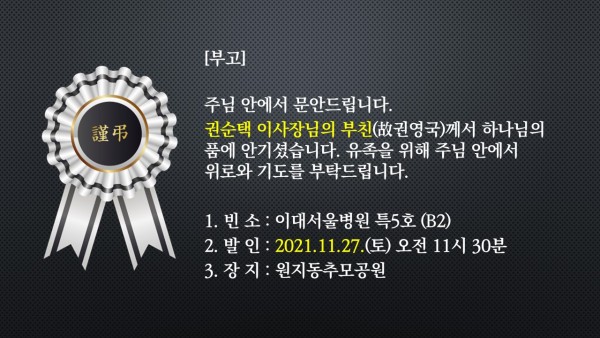 [부고] 권순택 이사장님 부친(故권영국)께서 하나님의 품에 안기셨습니다.
